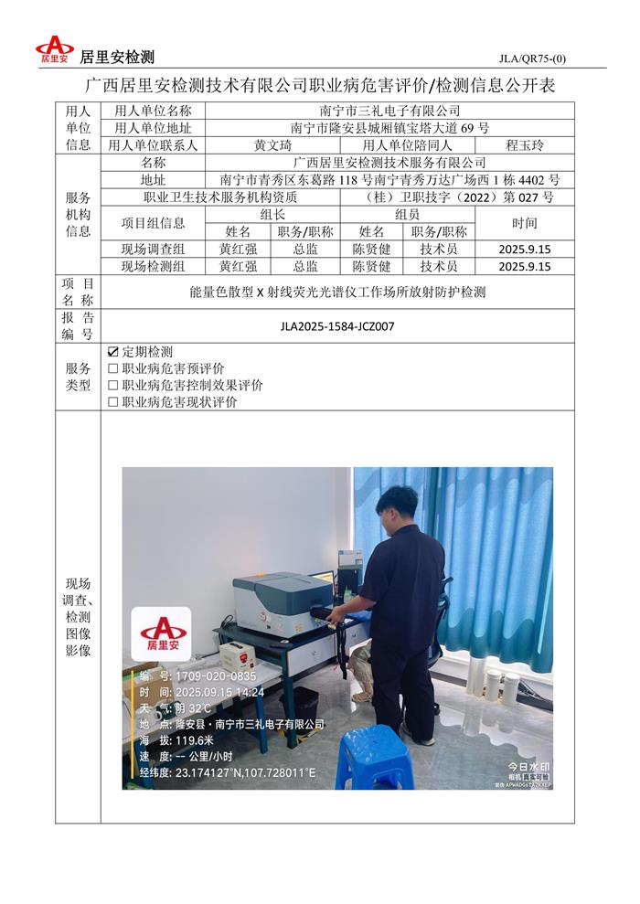 职业病危害评价/检测信息公开表(JLA2025-1584-JCZ007南宁市三礼电子有限公司)