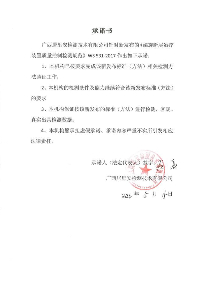 关于《螺旋断层治疗装置质量控制检测规范》的承诺书