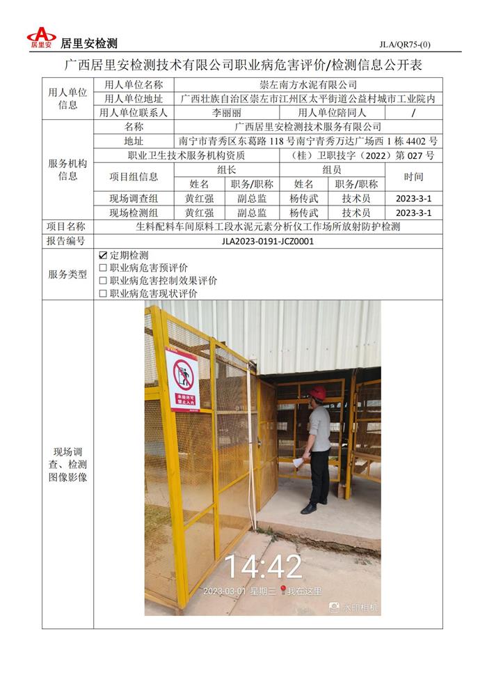 职业病危害评价/检测信息公开表(JCZ0001崇左南方水泥有限公司)