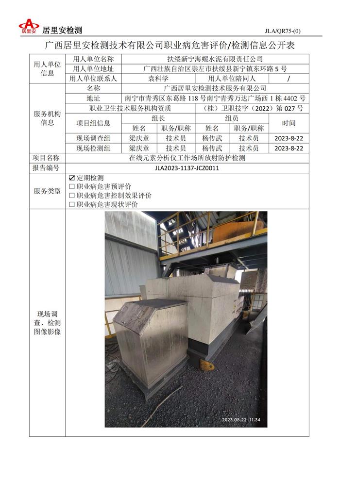 职业病危害评价/检测信息公开表(JCZ0011 扶绥新宁海螺水泥有限责任公司)