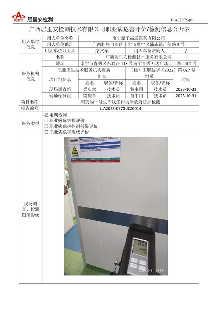 职业病危害评价/检测信息公开表(JCZ0014 南宁原子高通医药有限公司)