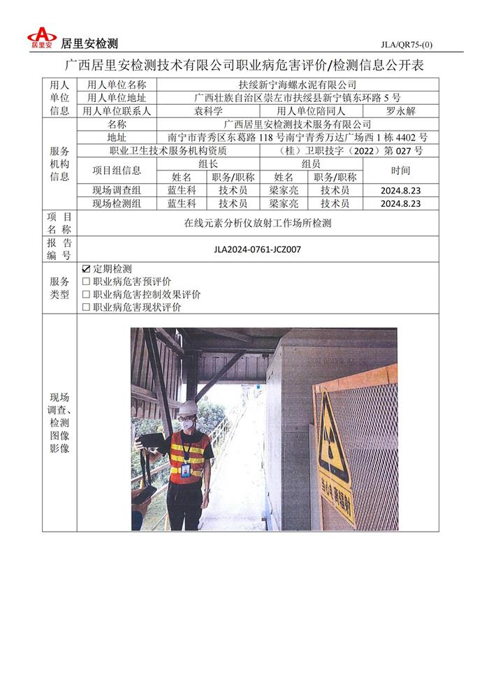 职业病危害评价/检测信息公开表(JLA2024-0761-JCZ007 扶绥新宁海螺水泥有限公司)