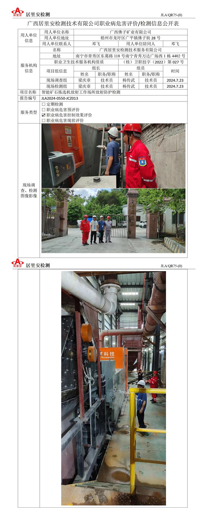 职业病危害评价/检测信息公开表(JLA2024-0550-JCZ013 广西佛子矿业有限公司)