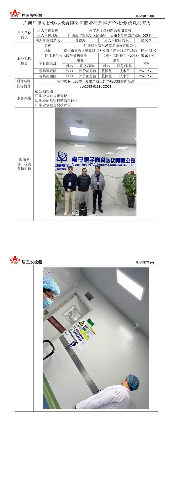职业病危害评价/检测信息公开表(JLA2025-0152-JCZ001 南宁原子高科医药有限公司)