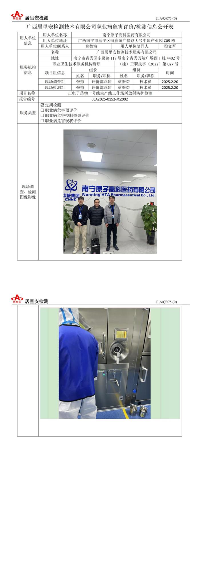 职业病危害评价/检测信息公开表(JLA2025-0152-JCZ002 南宁原子高科医药有限公司)