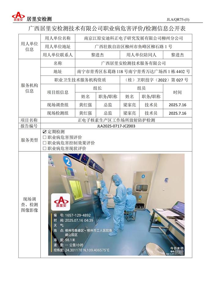 职业病危害评价/检测信息公开表(JLA2025-0717-JCZ003南京江原安迪科正电子研究发展有限公司柳州分公司)